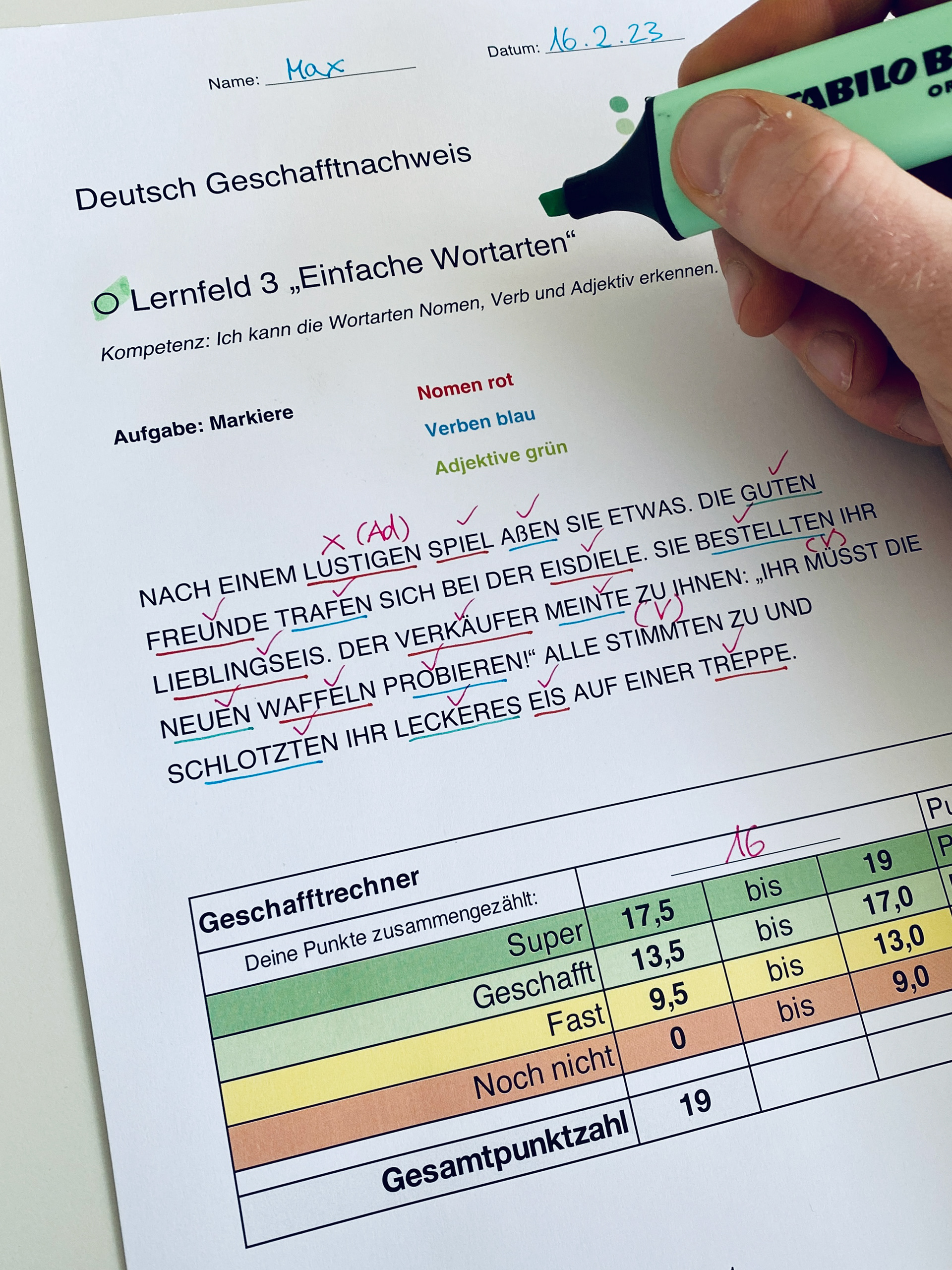 Geschafftnachweise zielen auf Kompetenzen abgegrenzter Lernfelder (z.B. die Groß- und Kleinschreibung). Sie zeigen Schüler*innen auf, inwiefern Kompetenzbereiche oder Teilschritte ihres Lernwegs bereits erfolgreich bewältigt werden. Eine herkömmliche Klassenarbeit vermischt meist viele verschiedene Kompetenzen – dadurch ist nicht immer ersichtlich, welche Kompetenz mit welcher Aufgabe erreicht werden soll. Auch fehlt oft eine kompetenzspezifische Rückmeldung: Wie viele Punkte einer Aufgabe müssen fürs Kompetentsein erreicht werden? Unser Geschafftfeedback gibt durch seine Prozente und Farben eine schülergerechte Antwort. Feedback aus Tests wird so zu einem wichtigen Anknüpfungspunkt für unterrichtliches Vorankommen.